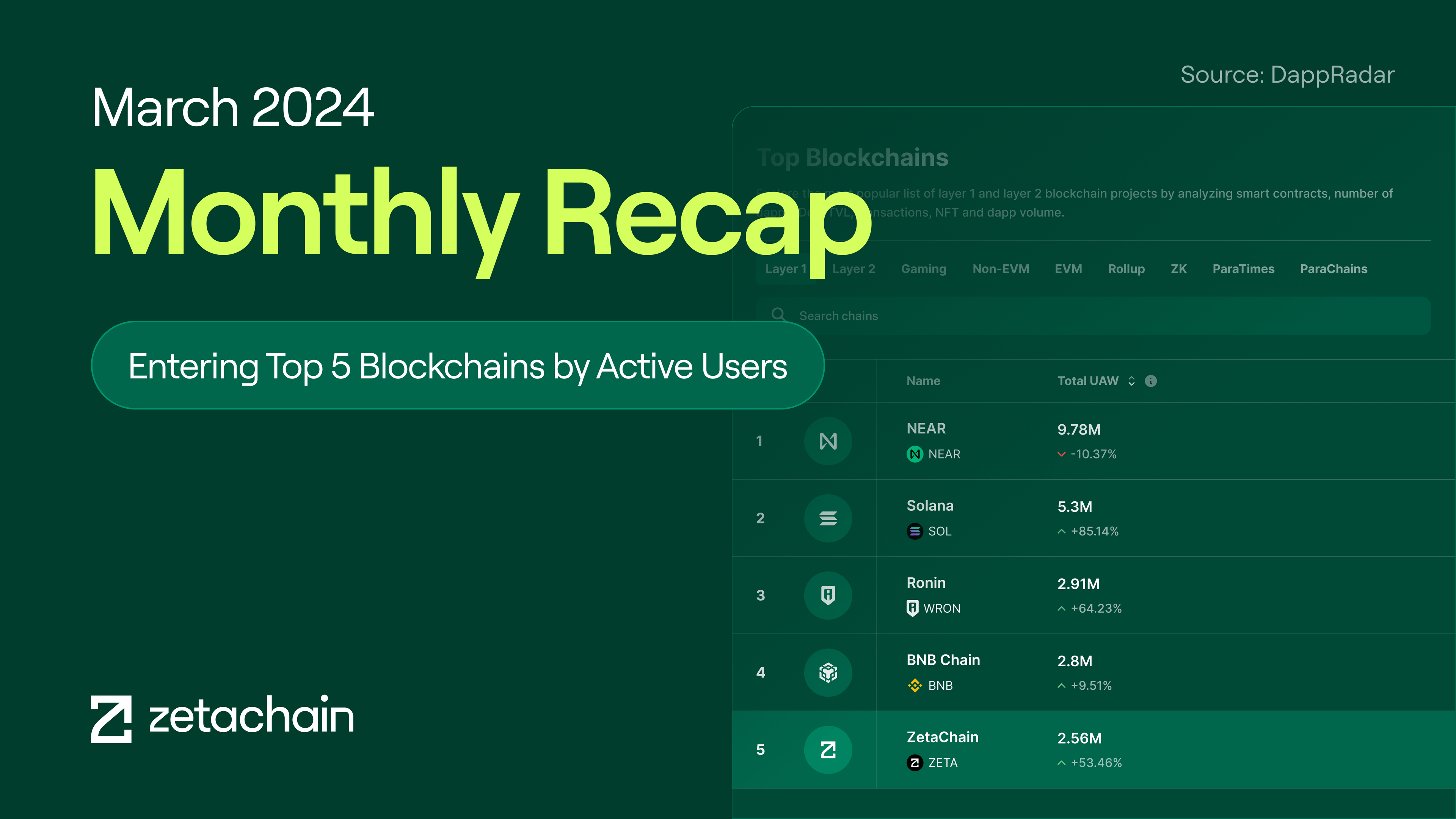 Only two months after the exciting ZetaChain Mainnet Beta release, we are proud to report ZetaChain crossed into the top five layer 1 blockchains by total weekly active users [Source: DappRadar, Top Layer 1 Blockchains by Total UAW in the last 30 days, April 4th, 2024]. Our large, active user base provides a strong platform to grow the omnichain dApp ecosystem as we step into Q2 2024.