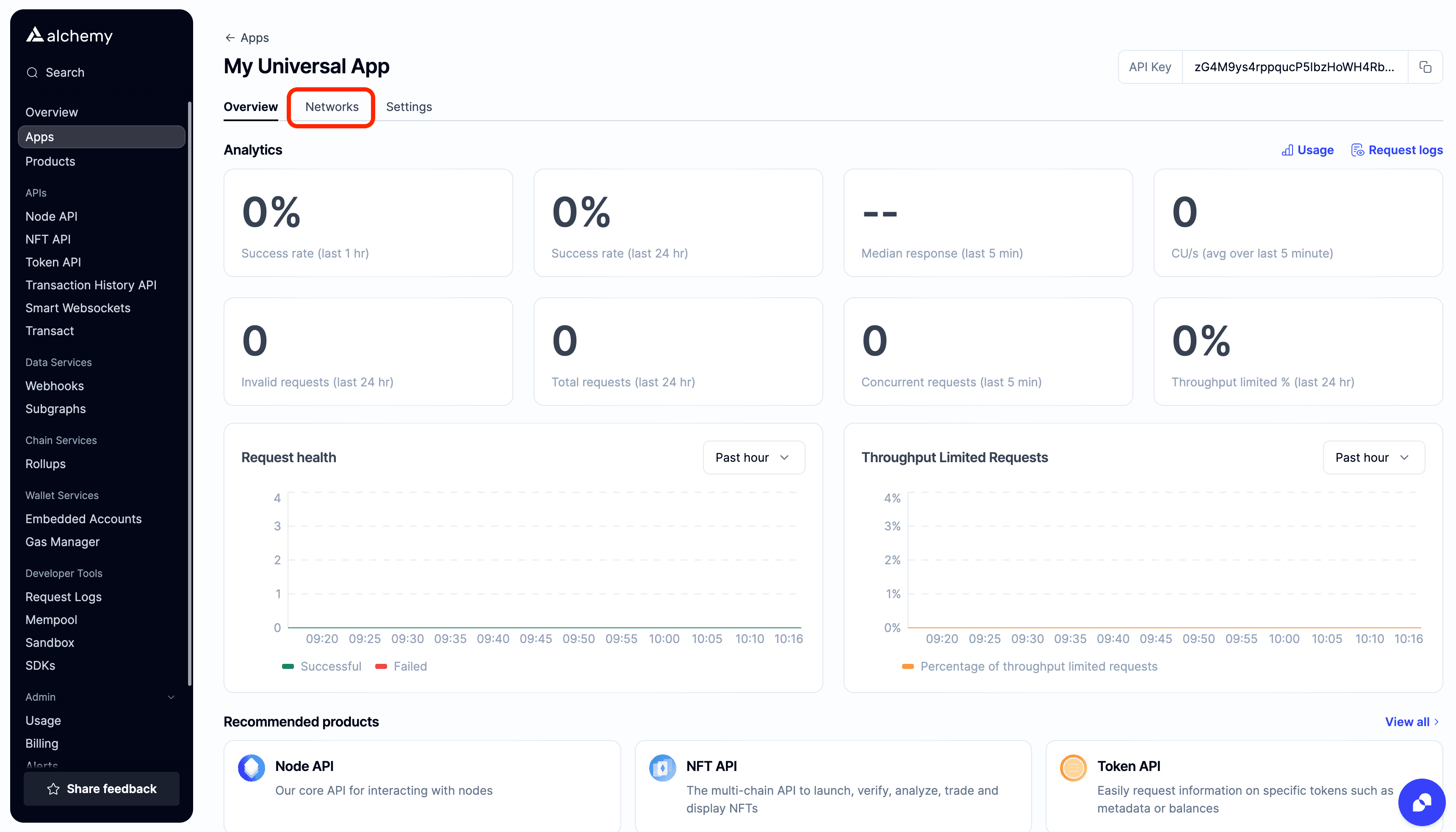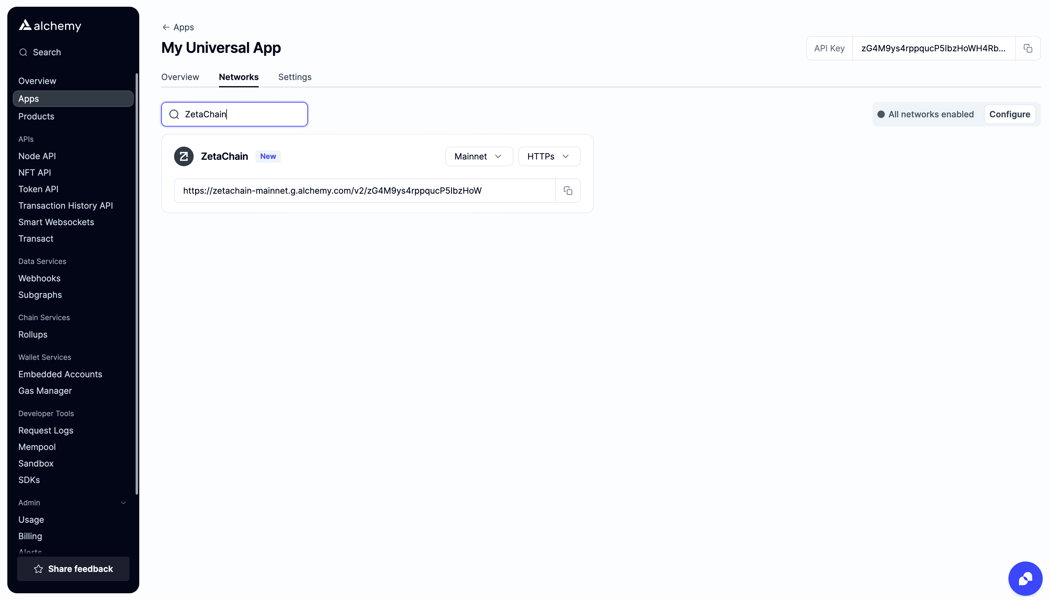 All apps on Alchemy are multichain by default. This means that your dApp immediately has access to all available Alchemy network chains upon creation. You can view all available networks and the related API URLs in the “Networks” tab. You also have access to switch between Mainnet or Testnet, if available.
